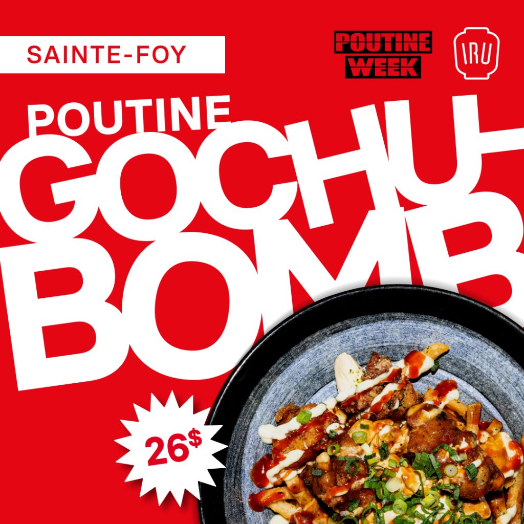 Offer valid from February 1 to February 7, 2026 inclusive, during regular business hours, exclusively at the IRU Ste-Foy location in Québec City. Valid for the “Gochu-Bomb” poutine priced at $26, as part of Poutine Week. Offer valid for dine-in orders only. Offer has no cash value and is non-transferable. While supplies last. IRU Restaurant reserves the right to modify or cancel the promotion without prior notice. Certain conditions may apply. See restaurant for details.