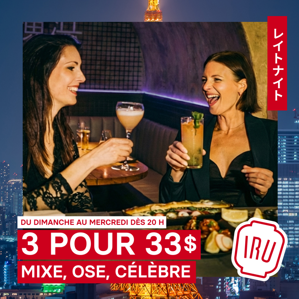 Du dimanche au mercredi, dès 20h dans toutes les succursales participantes au Québec. Valide uniquement pour les commandes en salle à manger. Offre non monnayable, non transférable et non cumulable avec toute autre promotion ou rabais en cours. Le restaurant IRU se réserve le droit de modifier ou d’annuler la promotion sans préavis. Certaines conditions peuvent s’appliquer. Détails en restaurant.
